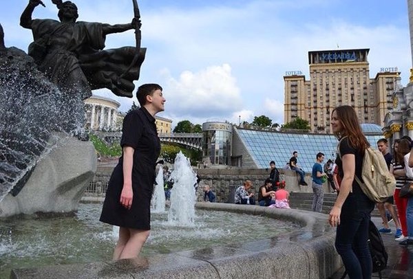 Как видно на снимке, Савченко стоит в фонтане на Майдане Независимости. При этом на лице украинки, которая 2 года провела в российском плену, видна искренняя радость.