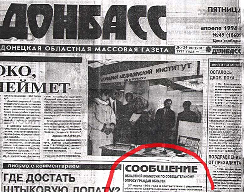 Тем не менее, референдум в Донбассе о статусе русского языка и федерализации Украины состоялся. Он прошел в совершенно законном русле тогдашней, «доконституционной» Украины. Стоит ли сейчас говорить о том, что власть, ворвавшаяся в Киев на шахтерских протестах и воцарившаяся на предательском Беловежском сговоре, попросту не услышала голос народа Донбасса. Стоит ли говорить о том, что киевская клика вполне предсказуемо получила в мае 2014-го..?